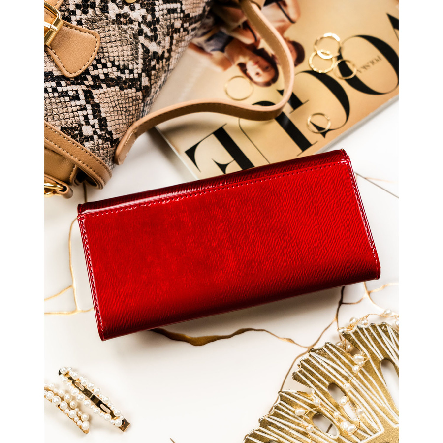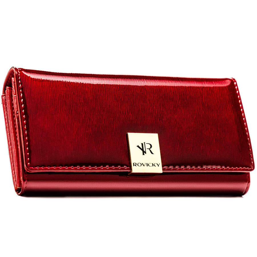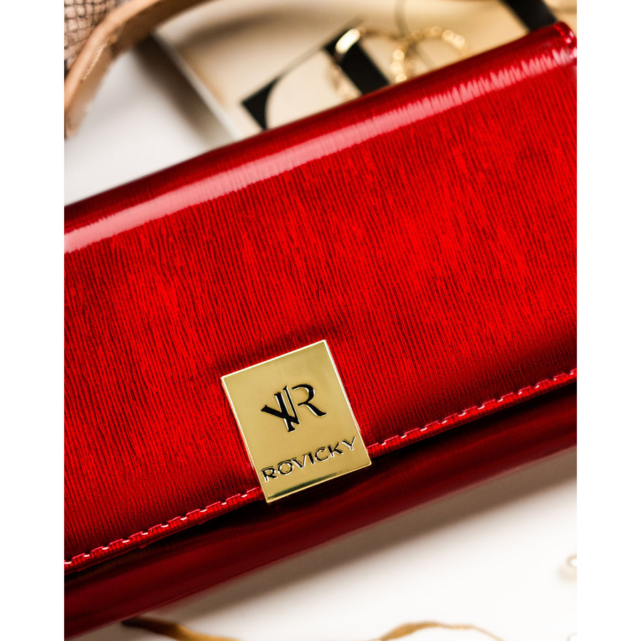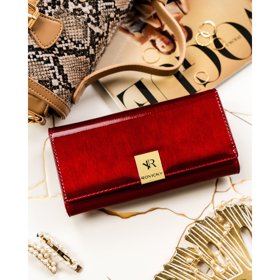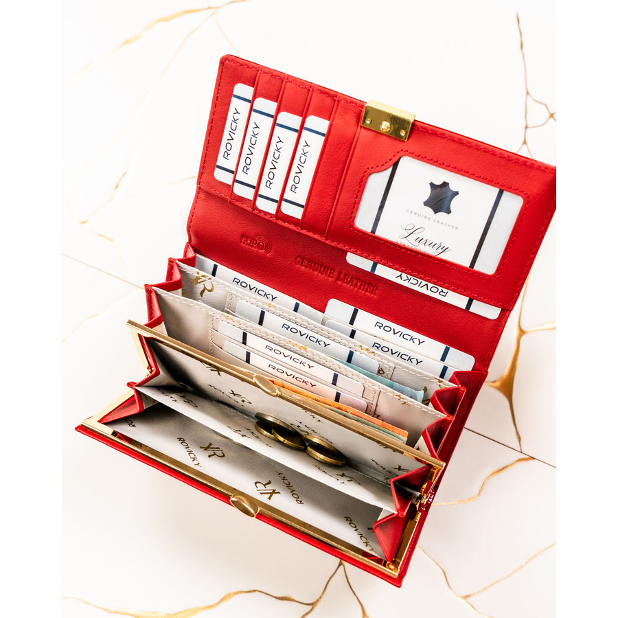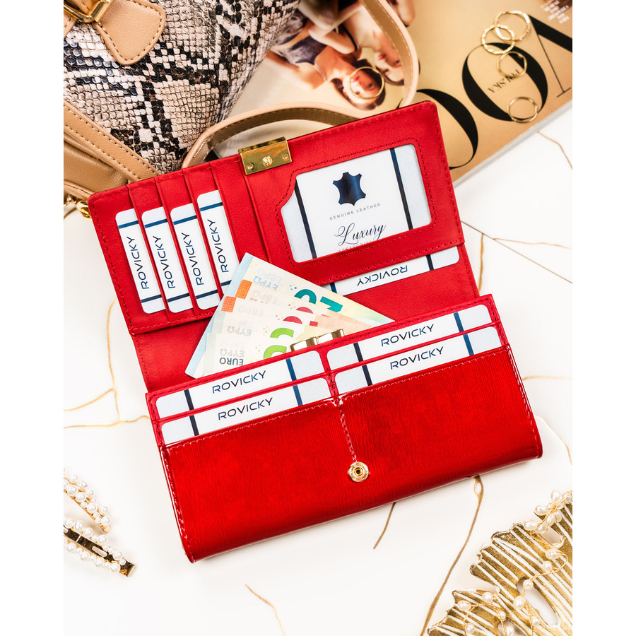 Duży, skórzany portfel damski w czerwonym kolorze zamykany na zatrzask - Rovicky