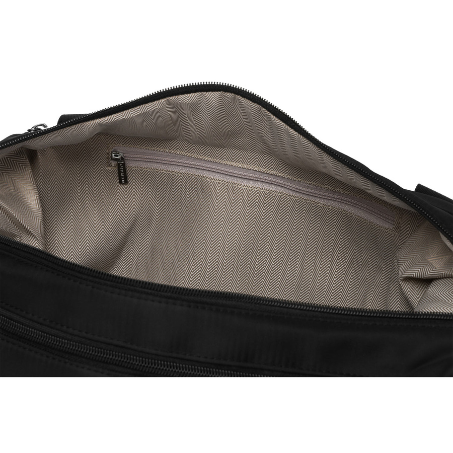 Torebka wyposażona jest w funkcjonalny uchwyt na walizkę, co czyni ją idealnym wyborem na podróże. Specjalny pasek na tylnej części torby pozwala wygodnie przymocować ją do rączki walizki.