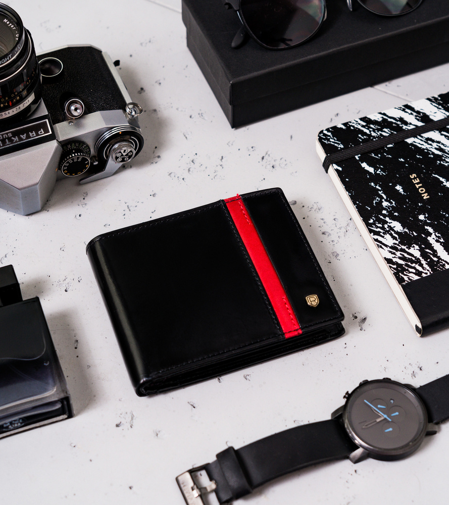 - Elegancki fason, który nigdy nie wyjdzie z mody | Czarny kolor to klasyka, a portfel w tym kolorze daje poczucie komfortu i świadomość, że możesz poczuć się modnie. Front portfela zdobi elegancki czerwony pasek